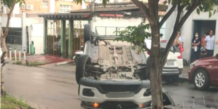 Na manhã deste domingo (1), um carro capotou após colidir com outro veículo na Avenida Airão, bairro Praça 14, zona centro-sul de Manaus.