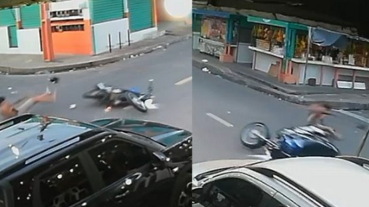 No domingo (1º), uma câmera de segurança registrou um motociclista pilotando sem capacete e ‘beijando o asfalto’, na rua Amorim Neves, bairro Compensa, zona oeste de Manaus.