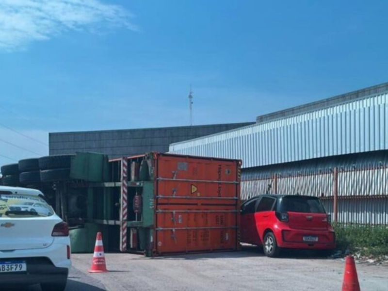 O veículo de carga tombou enquanto realizava uma manobra na rotatória, segundo relatos de testemunhas, o container se desprendeu do caminhão e caiu na pista.