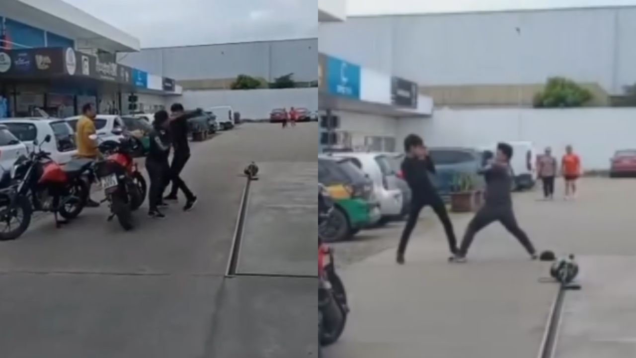 Os envolvidos seriam motociclistas de aplicativo, mas o motivo da briga não foi revelado. O tumulto só terminou quando funcionários de uma empresa intervieram e separaram os dois.