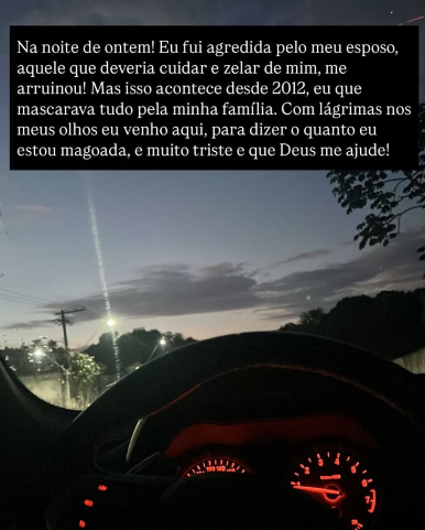 Em vídeo, Iolanda aparece com o braço ensanguentado e afirma que as agressões começaram em 2012. Os episódios de violência foram ocultados ao longo dos anos em nome da família e dos filhos. “Fui agredida pelo homem que deveria me proteger”, escreveu.
