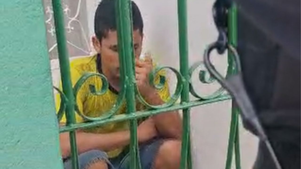 Os policiais encontraram o suspeito escondido no local, momento que foi registrado por imagens feitas durante a abordagem.