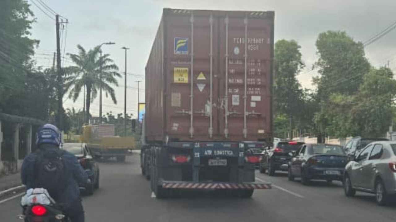 De acordo com relatos, o veículo transportava um contêiner que, por diversas vezes, balançou e quase caiu sobre outros automóveis que passavam pela via. A cena gerou apreensão entre os motoristas e pedestres que circulavam no local.