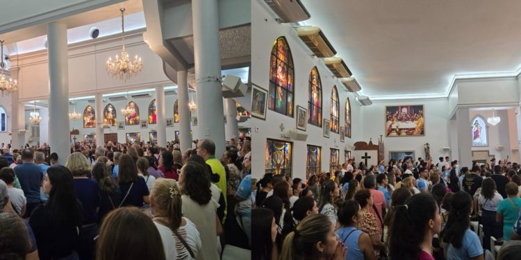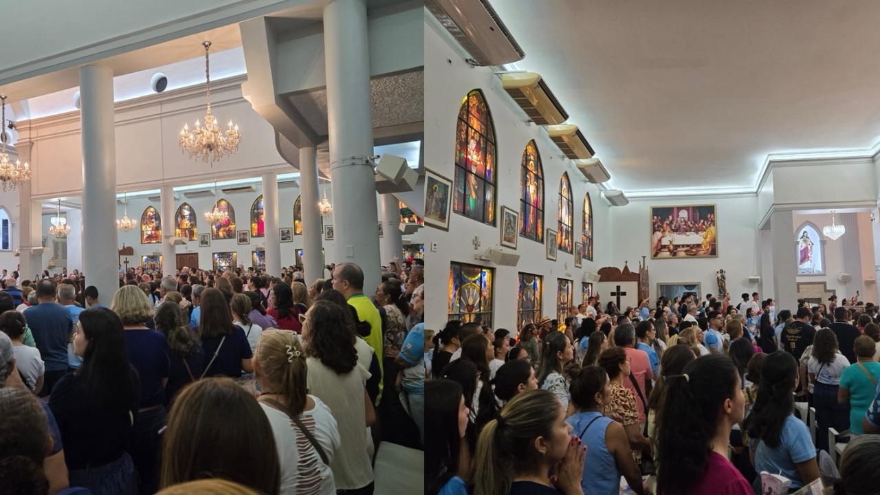 A Igreja de Nossa Senhora de Nazaré, no bairro Adrianópolis, ficou completamente lotada neste sábado (11) durante as celebrações do Círio de Nazaré 2025, uma das maiores manifestações de fé católica do Amazonas.