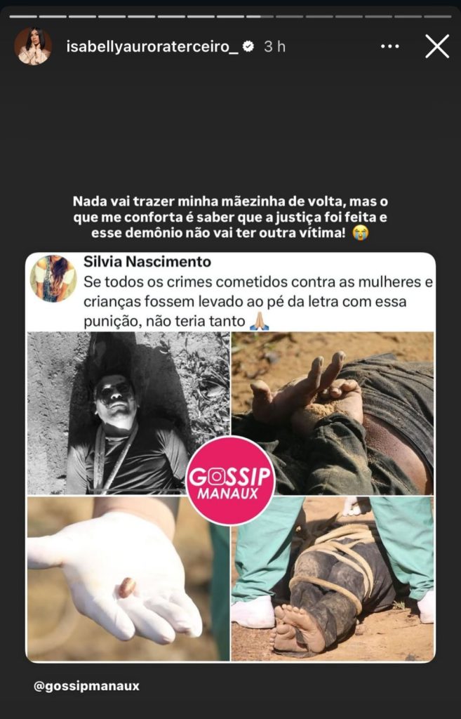 “Nada vai trazer minha mãezinha de volta, mas o que me conforta é saber que a justiça foi feita e esse demônio não vai ter outra vítima!”, escreveu ela em seu story.