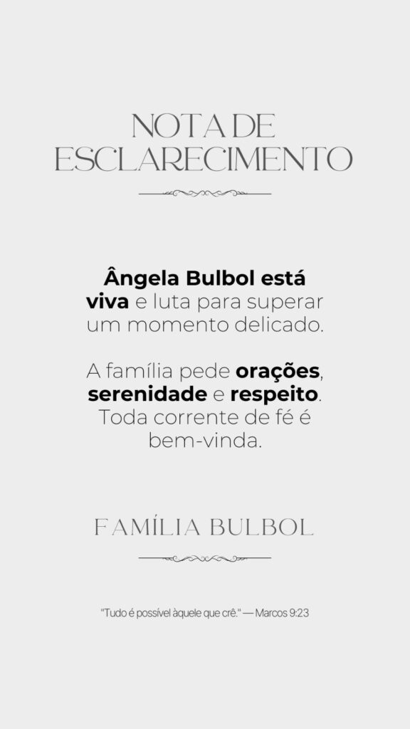 “Angela Bulbol está viva e luta para superar um momento delicado. A família pede orações, serenidade e respeito. Toda corrente de fé é bem-vinda.”