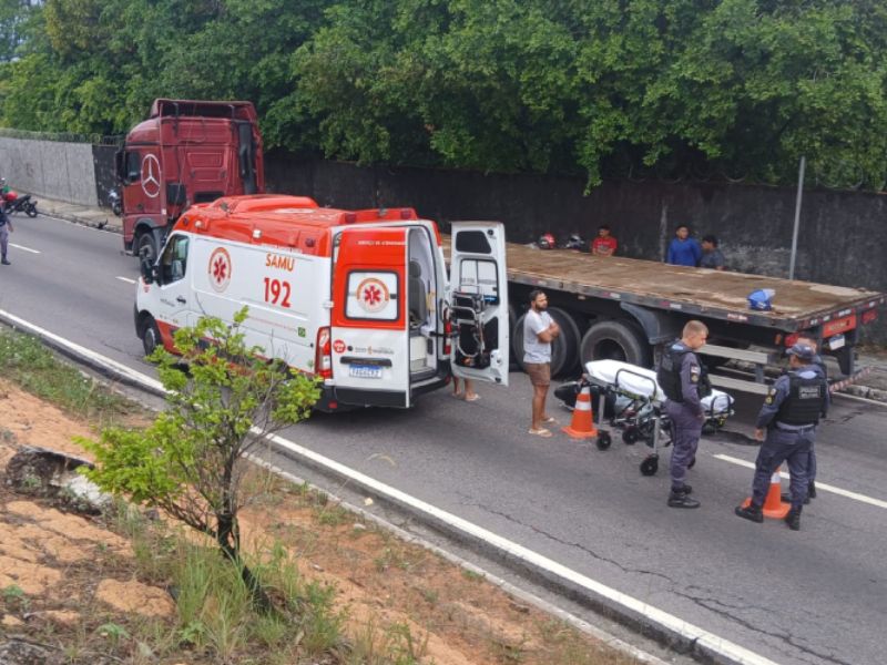 Duas pessoas que estavam em uma motocicleta caíram do veículo e, em seguida, foram atingidas por uma carreta que transitava na avenida.