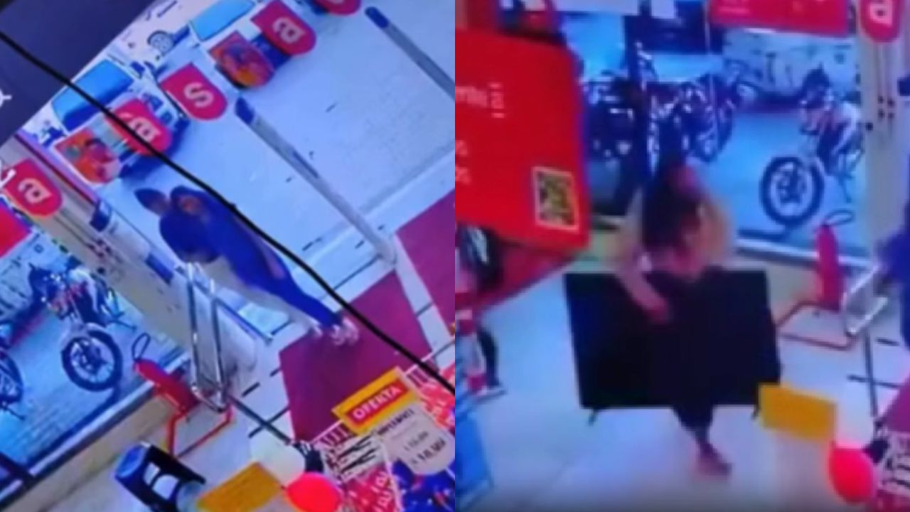 Nas imagens, uma das mulheres aparece “vigiando” se havia funcionários próximos, enquanto a outra pega a televisão e sai pela porta da frente com tranquilidade.
