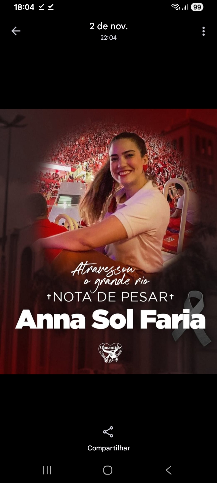 O Boi-Bumbá Garantido manifesta seu profundo pesar pelo falecimento de Anna Sol Faria, torcedora do Boi Garantido, irmã do nosso amo do boi, João Paulo Faria, sobrinha do saudoso Paulinho Faria, eterno apresentador, e filha de Zezinho Faria. Em nome de toda nação vermelha e branca, expressamos nossa solidariedade à família Faria, aos amigos e a todos que compartilham este momento de dor.Anna Sol partiu de forma precoce, mas sua luz permanecerá acesa na lembrança daqueles que a amaram e hoje sentem sua partida. Descanse em paz!