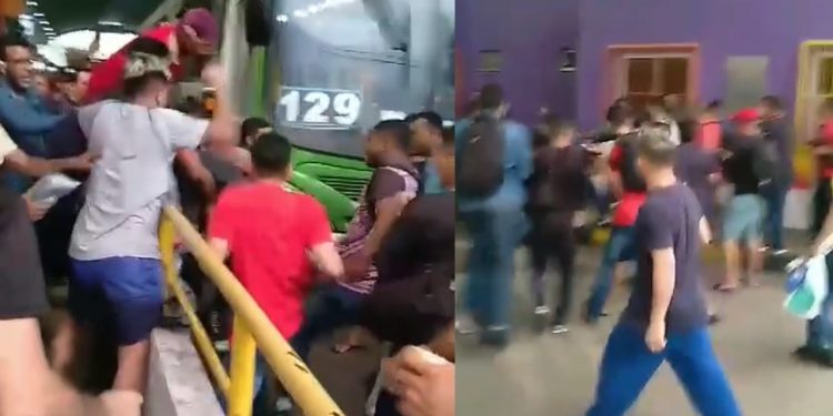 O homem aparece levando vários tapas e murros após ser retirado à força da linha 129.