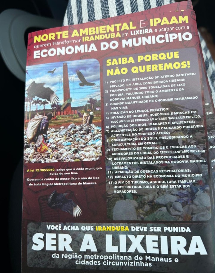 É no menor município do Amazonas, berço de balneários e maior produtor de hortifrutigranjeiros do Estado, responsável pelo abastecimento de parte das feiras de Manaus, que se planeja instalar o aterro sanitário para atender às necessidades da capital amazonense, a metrópole da Amazônia, e outros quatro municípios em seu entorno. Iranduba, que possui menos de 61 mil habitantes, será o fiel depositário de mais de três mil toneladas de lixo/dia. Para dar conta do recado, a previsão é a de que o aterro funcione 24 horas por dia, sete dias por semana.