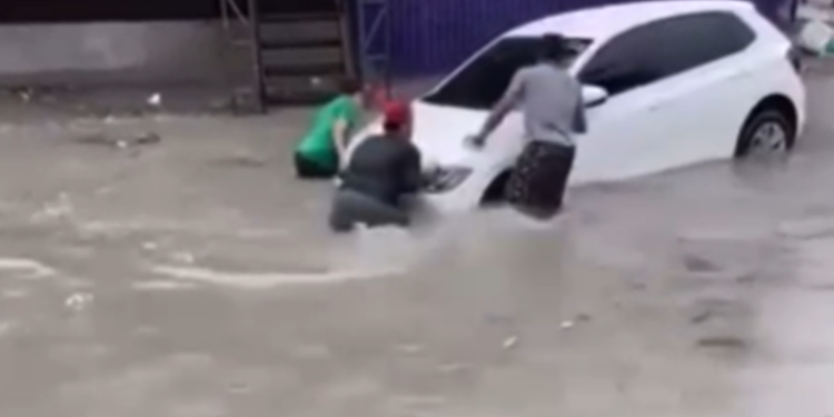No vídeo compartilhado mas redes sociais mostra o carro boiando na rua enquanto moradores tentam ajudar..