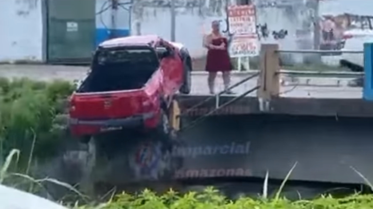 Um acidente grave na avenida Silves, bairro Cachoeirinha, zona sul de Manaus, causou momentos de tensão na tarde deste sábado (10). Uma picape vermelha colidiu com um ônibus de transporte público e, de forma impressionante, perdeu o controle ao impacto. O veículo avançou sobre a mureta da avenida e ficou parcialmente suspenso sobre um igarapé, com as rodas dianteiras penduradas sobre a água, gerando uma cena de grande risco e chamando a atenção de todos que passavam pela região da ponte.