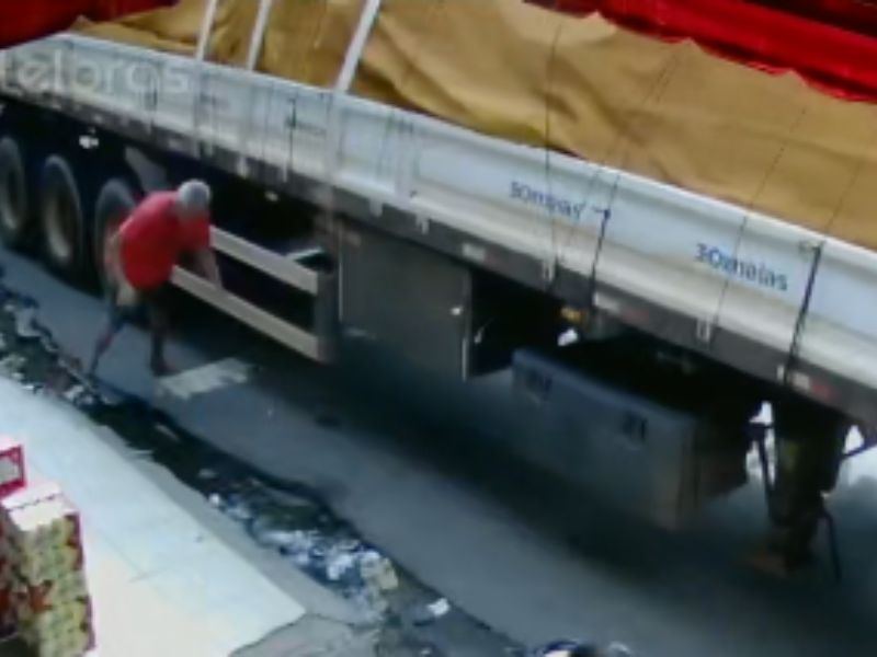 Imagens de segurança mostram que, enquanto uma carreta estacionada manobrava para sair, um morador que caminhava ao lado perdeu o equilíbrio e caiu, ficando com uma das pernas debaixo de uma das rodas.
