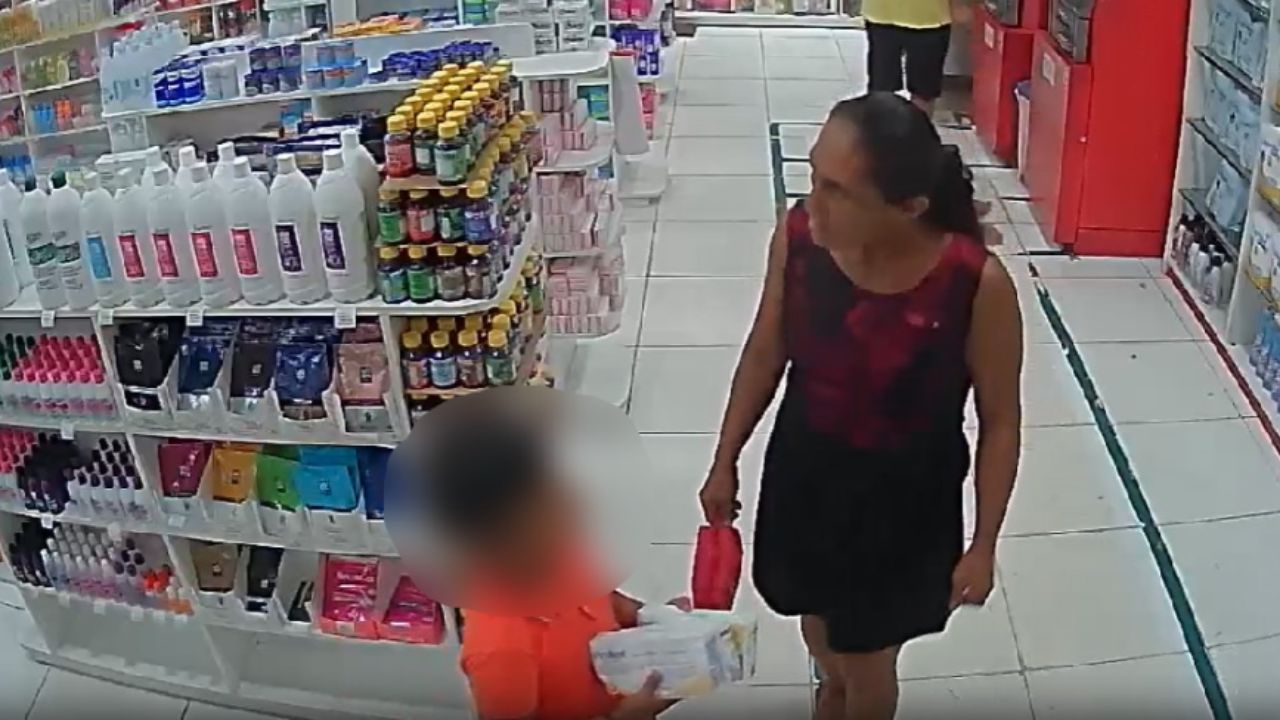 Na noite de quarta-feira (4), uma mãe foi flagrada por câmeras de segurança acompanhando o filho, com idade estimada entre 8 e 10 anos, durante um furto em uma drogaria localizada no bairro Jorge Teixeira, zona leste de Manaus.