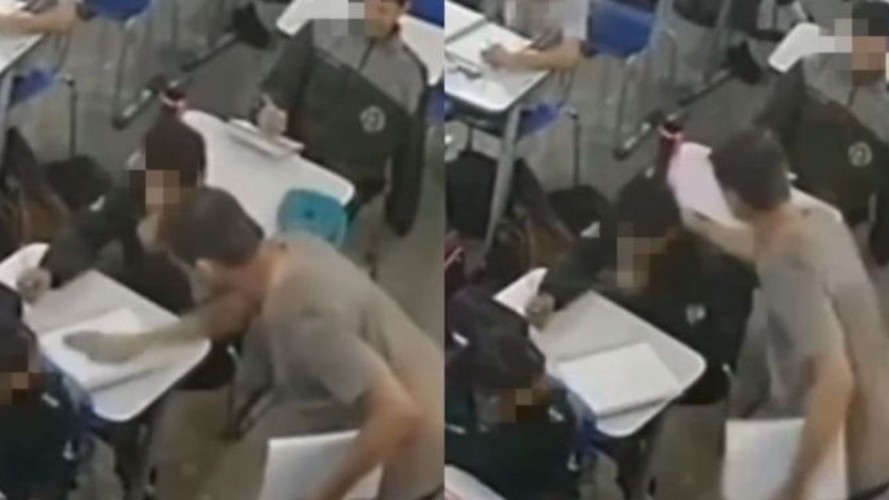 Nas imagens, o docente aparece batendo na mesa e desferindo vários tapas na criança, que tenta se defender. Uma funcionária da escola interveio e impediu novas agressões.