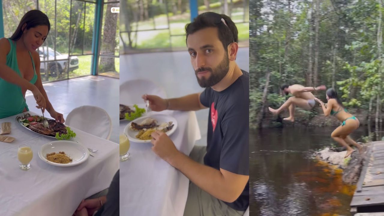 Isabelle levou Matteus para curtir o sábado (4), e já apresentou o tambaqui com farinha. Eles também foram tomar aquele banho de rio em Presidente Figueiredo.